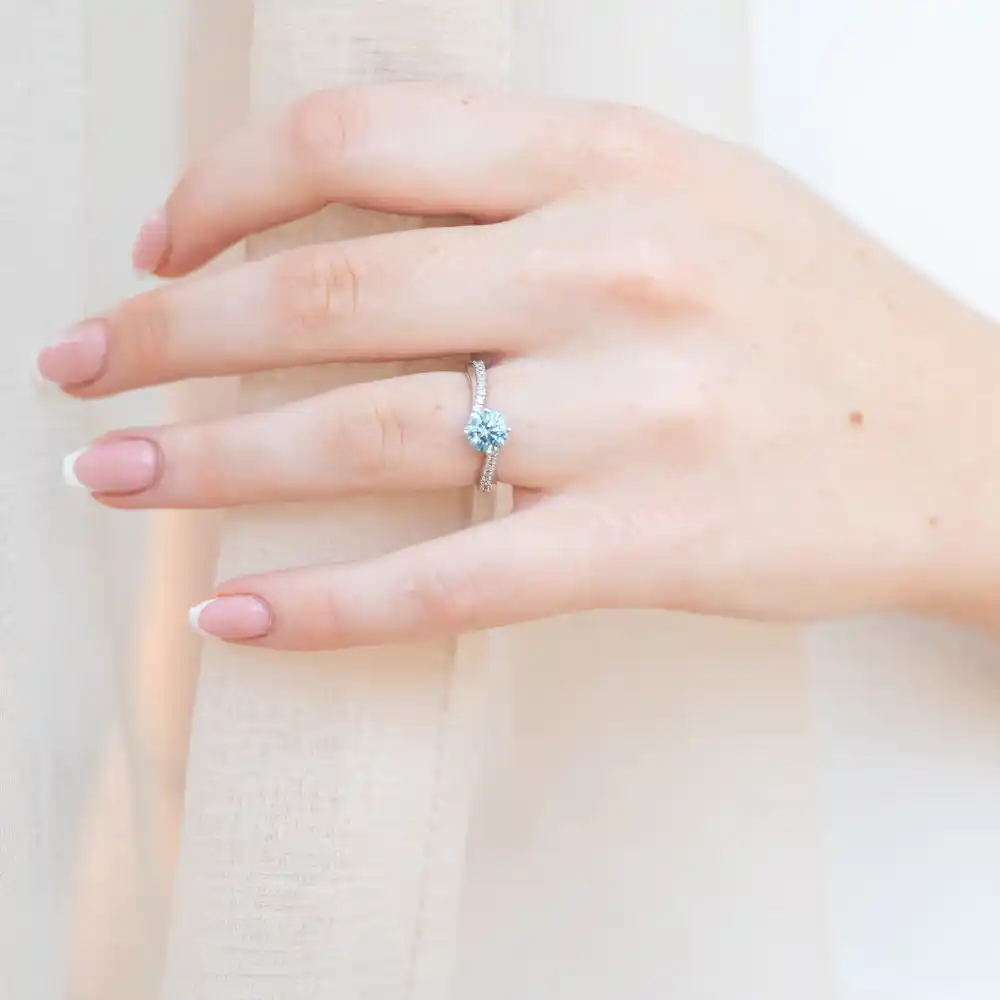 All Azure rings are crafted using Blue & White Laboratory Grown diamonds in this range for their brilliance, unique hues and shades, affordability and sustainability. It is important to note that no two stones are the same, so blue tones will vary from the stones used in images. Â All our Laboratory Diamonds are certified with Independent Laboratory Grading Certificates.