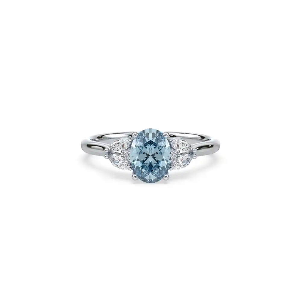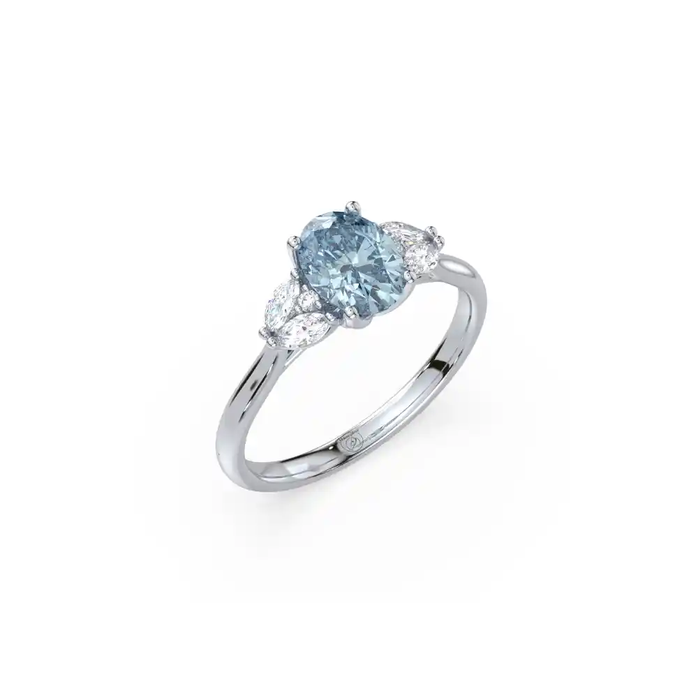 9ct White Gold Ring set with an Oval Brilliant Cut Lab Grown Diamond weighing 1,00ct, Fancy Intense Blue, VS1 with four Marquise Cut Lab Grown Diamonds totalling 0,40ct, DEF, VS1 & two round diamonds totalling 0,03ct.